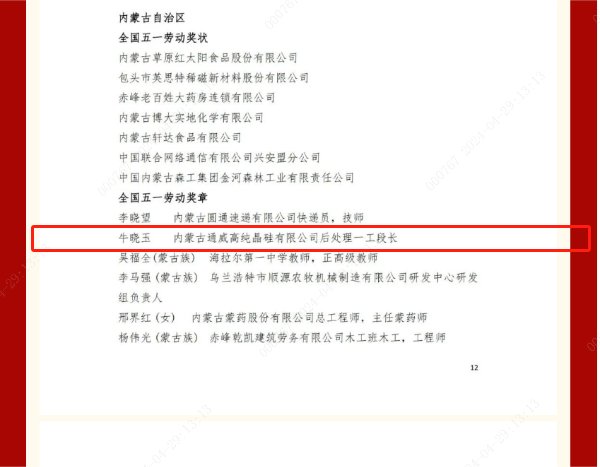 其中,通威股份副總裁、永祥股份總經理、正高級工程師李斌,內蒙古通威后處理一工段工段長牛曉玉,獲得全國五一勞動獎章;