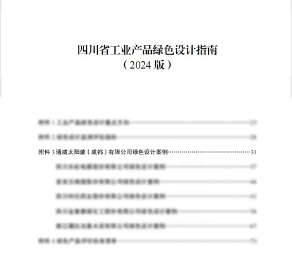 為加快推動(dòng)綠色產(chǎn)品開發(fā)和認(rèn)證,進(jìn)一步夯實(shí)全省工業(yè)綠色本底,提升“四川制造”工業(yè)產(chǎn)品綠色競(jìng)爭(zhēng)優(yōu)勢(shì),助力構(gòu)建綠色低碳循環(huán)發(fā)展經(jīng)濟(jì)體系,省經(jīng)濟(jì)和信息化廳聯(lián)合省市場(chǎng)監(jiān)管局組織編制了《四川省工業(yè)產(chǎn)品綠色設(shè)計(jì)指南(2024版)》,通威太陽能(成都)有限公司榮列其中。