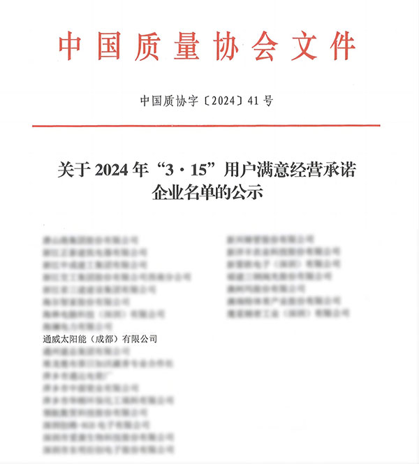 近日,由中國質量協會主辦的“3·15”用戶滿意經營承諾倡議活動圓滿落幕。通威太陽能(成都)有限公司憑借在消費者權益維護和用戶服務領域的出色表現,成功榮獲了“3·15”用戶滿意經營承諾企業稱號。此次榮譽是通威太陽能首次斬獲,不僅彰顯了公司在質量管理方面的卓越實力,更是對公司用戶服務水平的極高認可。