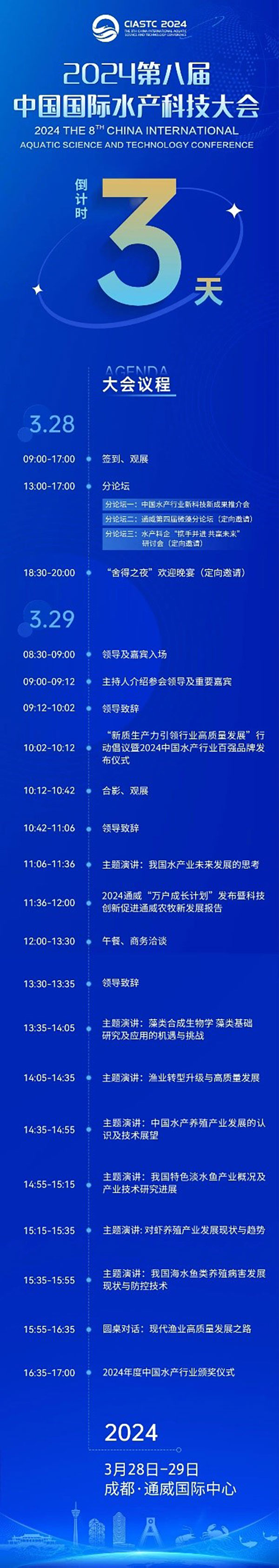 3月28-29日2024第八屆中國國際水產(chǎn)科技大會將在成都通威國際中心隆重舉行大會期間來自中央、省、市政府部門及行業(yè)協(xié)會重要領導、行業(yè)專家、領袖企業(yè)家及企業(yè)精英將齊聚一堂探討水產(chǎn)行業(yè)可持續(xù)發(fā)展道路讓世界聽到中國水產(chǎn)聲音賦能全球水產(chǎn)行業(yè)高質量發(fā)展