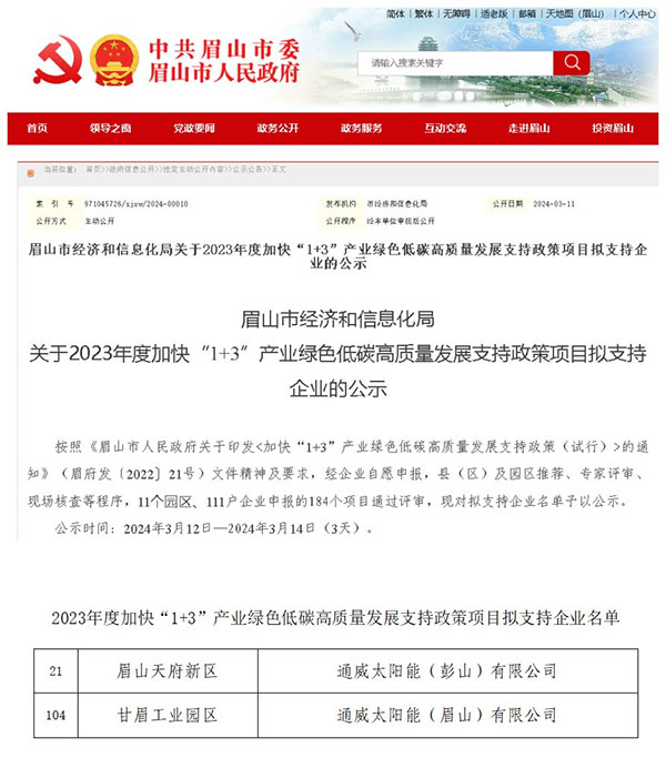 3月12日,中共眉山市委市政府官方網站正式公示了《2023年度加快“1+3”產業(yè)綠色低碳高質量發(fā)展支持政策項目擬支持企業(yè)名單》,通威太陽能眉山基地、彭山基地經自主申報,通過縣(區(qū))及園區(qū)推薦、專家評審等層層審核,成功入列其中。