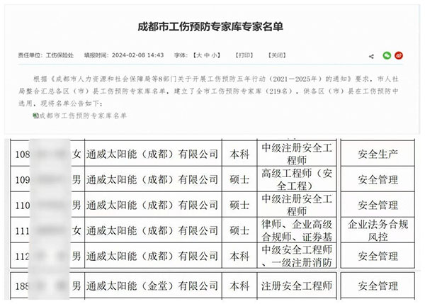 2月8日,成都市人力資源和社會保障局發布成都市工傷預防專家庫專家名單,通威太陽能6名相關領域專家成功入選。