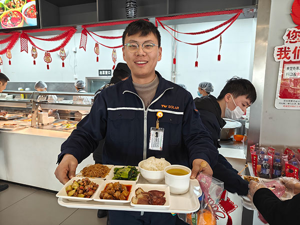 我們?cè)谝黄穑恰凹摇笔恰皥F(tuán)圓”,在通威太陽(yáng)能,每逢新春佳節(jié),總有一群堅(jiān)守崗位就地過(guò)節(jié)的員工,為了讓員工們?cè)诠疽材苓^(guò)上安心年、暖心年。公司聯(lián)合食堂供應(yīng)商特別準(zhǔn)備了美味可口的年夜飯、春節(jié)福利餐,讓員工即便不能回鄉(xiāng),也能與通威家人們一起同享美食、共度佳節(jié),感受不一樣的“家”的味道。