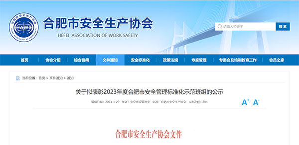 “2023年度合肥市安全管理標準化示范班組”的公示