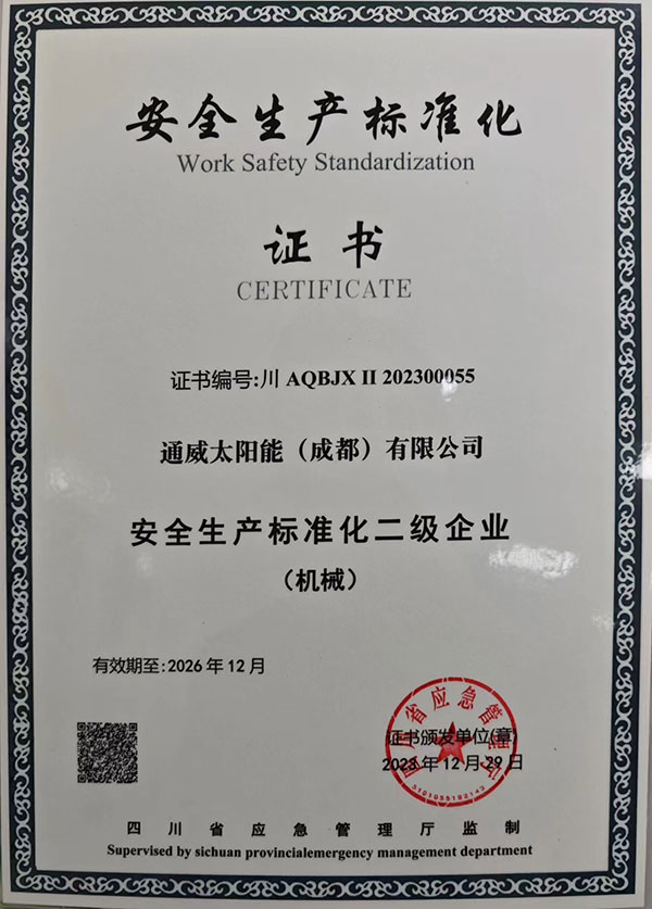 未來(lái),通威太陽(yáng)能還將繼續(xù)致力于提升安全生產(chǎn)水平,保障員工的生命財(cái)產(chǎn)安全,為可持續(xù)發(fā)展貢獻(xiàn)更多力量。同時(shí),也將持續(xù)推動(dòng)安全生產(chǎn)標(biāo)準(zhǔn)提升,爭(zhēng)取在等級(jí)評(píng)定中更上一層,為公司的可持續(xù)發(fā)展貢獻(xiàn)力量。