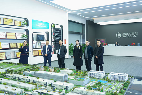 在通威太陽(yáng)能智能制造展廳,邢志剛董事長(zhǎng)一行聽(tīng)取通威太陽(yáng)能發(fā)展歷程、項(xiàng)目建設(shè)、產(chǎn)能布局及取得的榮譽(yù)獎(jiǎng)項(xiàng)等相關(guān)情況介紹,詳細(xì)了解了通威太陽(yáng)能雙流基地項(xiàng)目建設(shè)進(jìn)度、項(xiàng)目投產(chǎn)情況、產(chǎn)能規(guī)劃以及各板塊產(chǎn)業(yè)布局情況。
