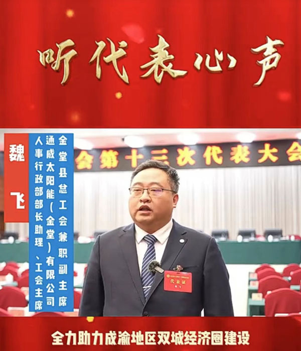 會中,魏飛接受采訪表示,作為光伏產業一線工人代表參會并當選,深感責任重大,接下來將堅定信心、立足崗位,著力服務中心、服務大局,把個人和企業的成長融入到金堂縣高質量發展的大局中,貢獻通威工人力量。