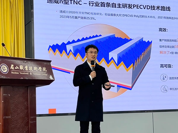 授課現場,姚騫總團隊以《通威TNC電池技術與優(yōu)勢分析》為題,圍繞太陽能電池技術展開分享,深入淺出地講解了科技創(chuàng)新的魅力和通威N型TNC電池技術的先進性,闡述了每一次原創(chuàng)技術的產生都是經過數不清的實驗測試。堅持不懈的科技工作者精神是每一位科技工作者應具備的基本素養(yǎng)。姚騫總鼓勵同學們一定要認真學習,打好學習基礎,不斷進步,希望通過授課可以培養(yǎng)同學們科技創(chuàng)新的信念,將來為家鄉(xiāng)建設添磚加瓦。