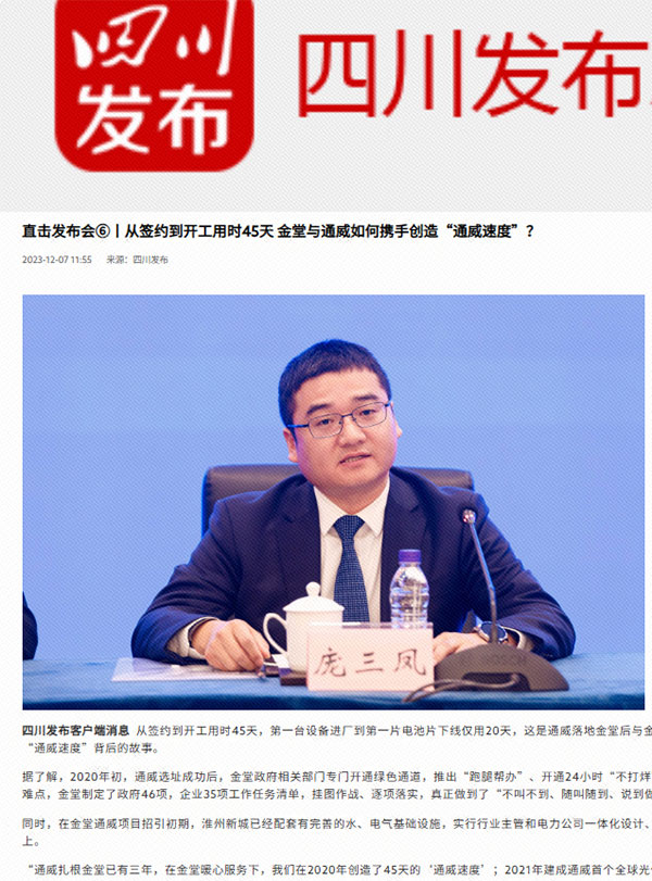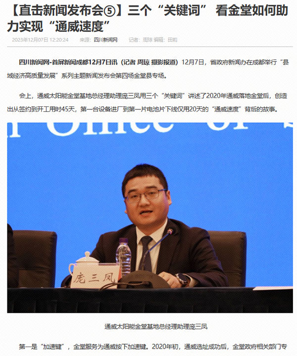 12月7日,四川省政府新聞辦在成都舉行“縣域經濟高質量發展”系列主題新聞發布會,金堂縣委副書記、縣長王安寧參加,通威太陽能金堂基地總經理助理龐三鳳受邀參會,對通威太陽能高質量發展情況進行介紹并接受采訪。來自中央、省、市近二十家主流媒體參加新聞發布會。