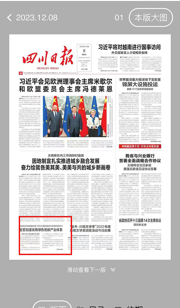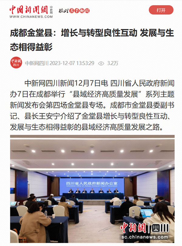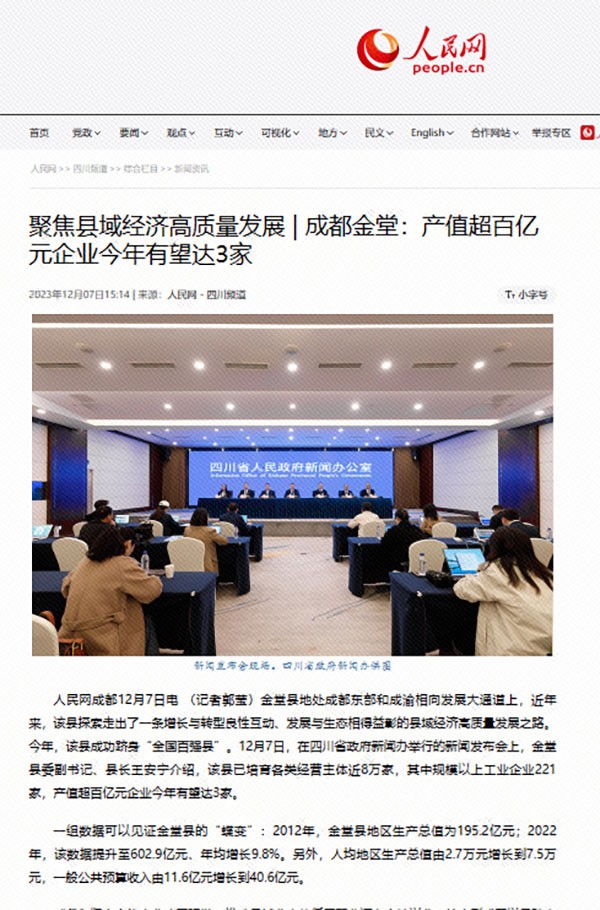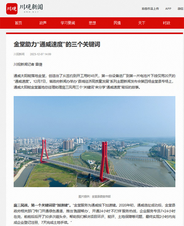 發布會獲得人民網、四川發布、中國新聞網、四川新聞網、四川日報、成都日報、川觀新聞等多家媒體聚焦報道。各媒體圍繞推動縣域經濟高質量發展的舉措、成果,以及成功創建全國百強縣的背后故事等內容進行了詳細報道,聚焦“經濟之變”“產業之變”“活力之變”和“城鄉之變”,并指出在產業方面,縣域業態從低質聚業邁向高端興業,形成了以通威太陽能為代表的晶硅光伏為核心的綠色低碳產業體系,助力金堂縣實現增長與轉型良性互動、發展與生態相得益彰的縣域經濟高質量發展之路。