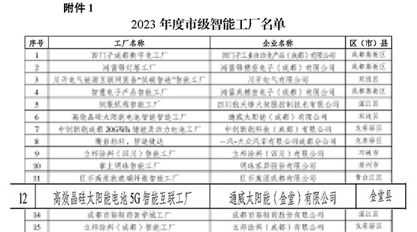 制造業作為國民經濟的主體,智能制造是我國加快建設制造強國的主攻方向,而智能化工廠是實現“智能制造”的必經之路。為貫徹市委市政府制造強市戰略部署,落實《成都市工業經濟工作領導小組辦公室關于印發成都市智能制造三年行動計劃(2021—2023年)的通知》(成工經領辦〔2021〕15號)和《成都市人民政府關于印發成都市支持制造業高質量發展若干政策措施的通知》(成府規〔2023〕2號)文件精神,加快推動制造業數字化、網絡化、智能化轉型,根據《成都市經濟和信息化局關于印發成都市智能工廠和數字化車間認定管理辦法的通知》(成經信辦〔2023〕23號)相關要求,認定通威太陽能金堂基地高效晶硅太陽能電池5G智能互聯工廠為“成都市智能工廠”。
