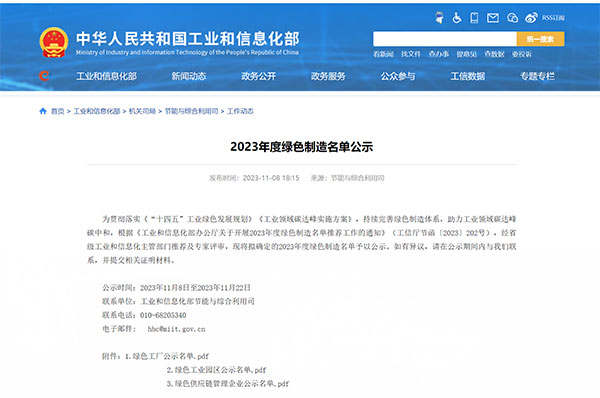 11月8日,中華人民共和國工業和信息化部發布了《2023年度綠色制造名單公示》(公示期為14日),通威太陽能安徽公司成功入選“2023年度國家級綠色工廠”。