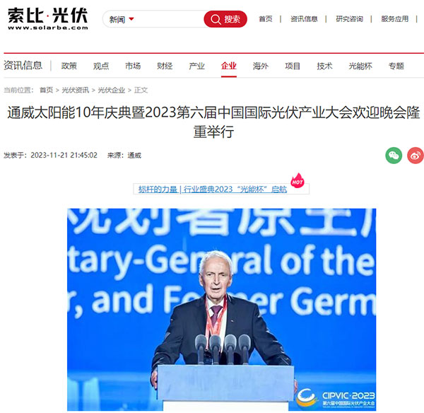 人民網、中華網分別聚焦通威太陽能十年·全球合作伙伴大會和通威太陽能10年慶典暨2023第六屆中國國際光伏產業大會歡迎晚會,報道了通威太陽能十年新書《必然性》的發布及慶典晚會的舉辦。同時,鳳凰網、和訊網、紅商網、索比光伏網等財經和光伏行業媒體也爭相報道通威太陽能十年盛典事宜,彰顯了通威太陽能強勁的發展實力和行業影響力。