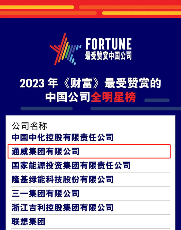 11月21日,《財(cái)富》最受贊賞的中國(guó)公司榜單正式發(fā)布,通威榮列榜單,位列第43位。《財(cái)富》最受贊賞的中國(guó)公司榜單是中國(guó)公司“軟實(shí)力”的晴雨表,此次入圍榜單,彰顯了通威強(qiáng)勁的發(fā)展實(shí)力,以及品牌知名度、美譽(yù)度,行業(yè)影響力、話語(yǔ)權(quán)的不斷提升與突破,讓世界看見(jiàn)中國(guó)光伏品牌力量。