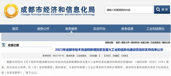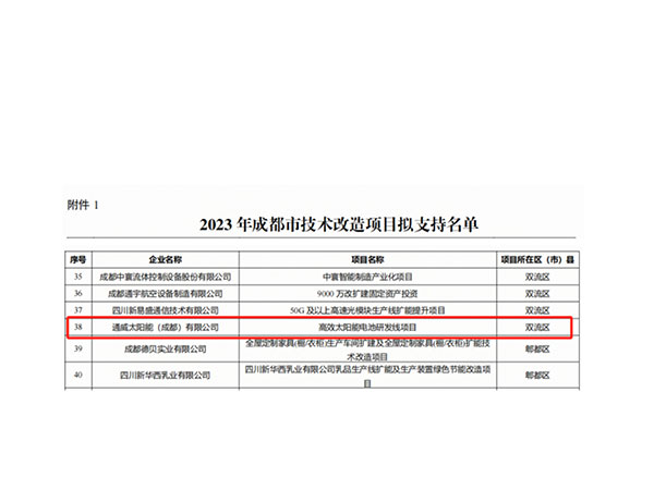 通威太陽(yáng)能雙流基地申報(bào)的2023年成都市技術(shù)改造補(bǔ)助項(xiàng)目—高效太陽(yáng)能電池研發(fā)項(xiàng)目順利通過(guò)成都市經(jīng)信局專家評(píng)審,成功通過(guò)申報(bào),2023年10月10日—10月18日,成都市經(jīng)濟(jì)和信息化局對(duì)2023年成都市技術(shù)改造和新增投資及重大工業(yè)和信息化建設(shè)項(xiàng)目支持名單進(jìn)行公示。