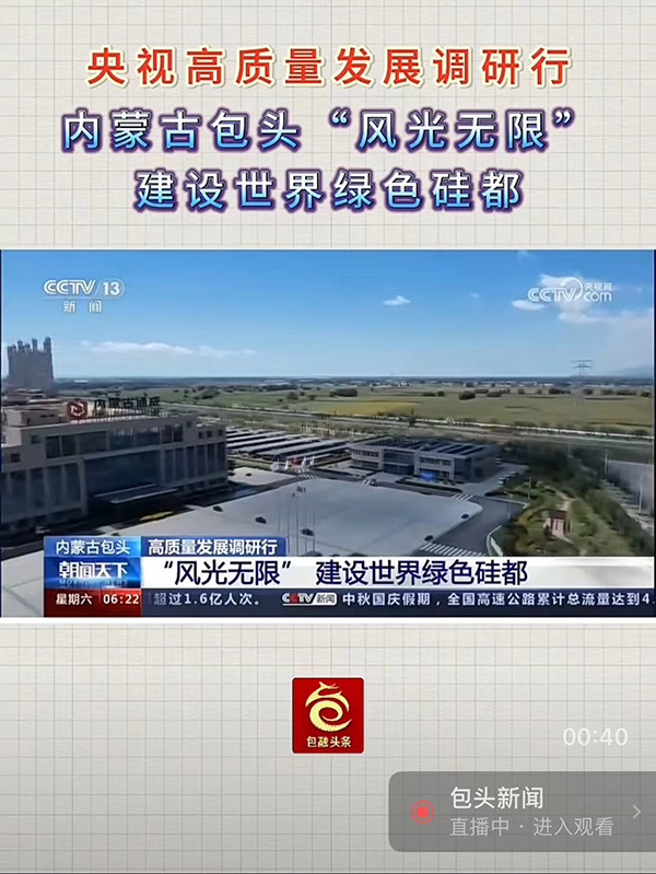 近日,央視新聞頻道推出《央視高質量發展調研行》 專題報道走進內蒙古包頭建設世界綠色“硅都”,報道包頭這座老工業城市把握機遇、加速破題,通過產業轉型升級推動城市發展實現新突破、開創新局面的成效和經驗。內蒙古通威作為包頭這座老工業城市升級轉型的重要載體,充分發揮“領頭雁”和“排頭兵”的作用,對帶動下游產業發展發揮了積極作用,讓上下游企業的戰略聯盟和產業配合,推動產業更快的發展