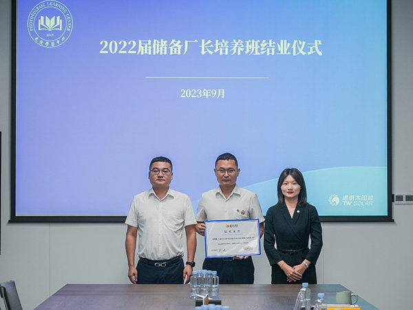 為總結(jié)回顧儲(chǔ)備廠長(zhǎng)培養(yǎng)項(xiàng)目成果,全面展現(xiàn)儲(chǔ)備管理干部的快速成長(zhǎng)成效,9月14日,通威太陽(yáng)能各基地順利開(kāi)展2022屆儲(chǔ)備廠長(zhǎng)培養(yǎng)項(xiàng)目結(jié)業(yè)儀式。通威太陽(yáng)能總經(jīng)理周華、總經(jīng)理助理陳君及各基地負(fù)責(zé)人攜雙流、眉山、金堂、通合四地項(xiàng)目導(dǎo)師及學(xué)員共同出席本次活動(dòng)。