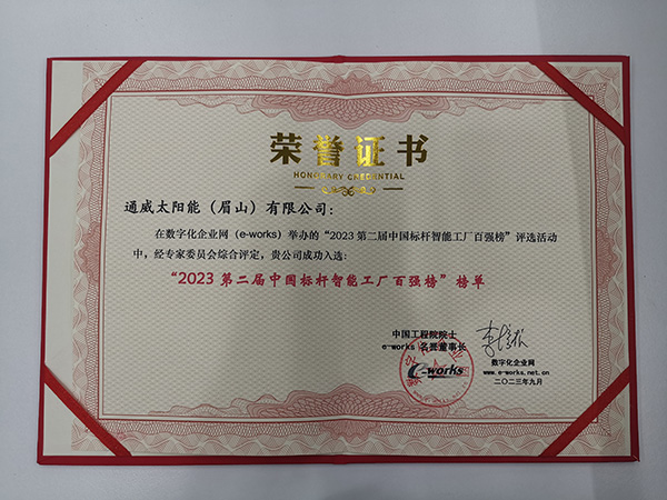9月7日,在數字化企業網(e-works)舉辦的“第二屆中國標桿智能工廠百強榜單”評選活動中,通威太陽能眉山基地憑借在智能制造領域的卓越表現和突出貢獻成功入選“2023年第二屆中國標桿智能工廠百強榜”,獲得業界高度認可。