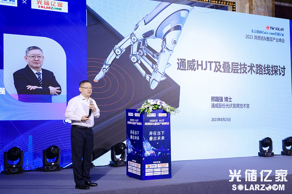 8月25日,由東吳機械和Solar zoom光儲億家聯合主辦的2023 HJT異質結&疊層產業峰會在上海召開,通威受邀參加此次論壇。通威股份光伏首席技術官邢國強博士出席會議,進行專題演講并參與圓桌論壇,向業內分享通威如何在技術革新迅速的時代抓住HJT及疊層電池技術的發展機遇并持續領先,獲得現場的強烈關注及熱烈反響。