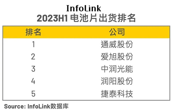 InfoLink 2023上半年電池片出貨排名出爐,通威蟬聯全球第一