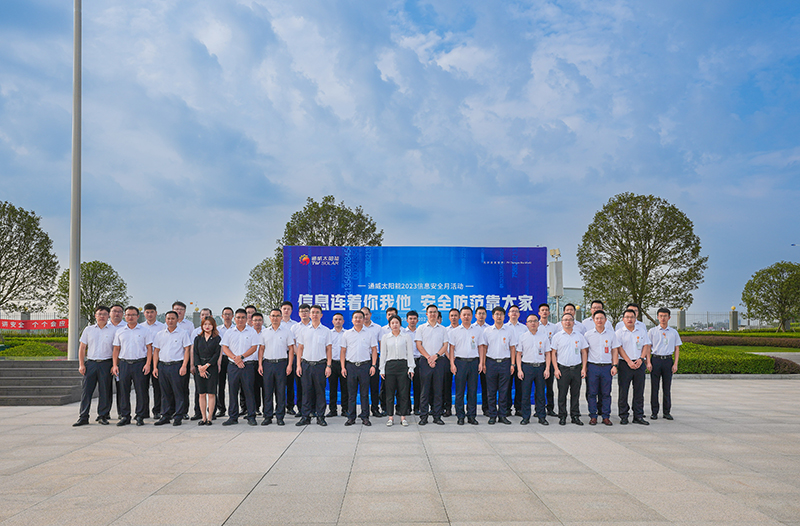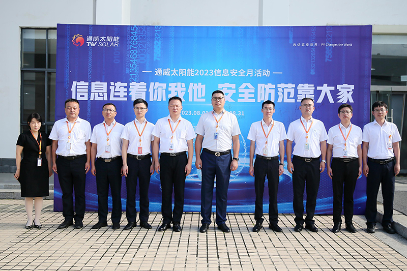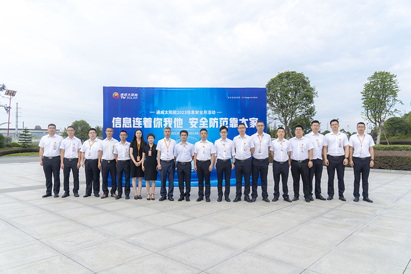 為應對當前日益復雜的信息安全形勢,進一步普及信息安全知識,加強公司全員信息安全意識,激發(fā)信息安全主人翁意識。7月31日,通威太陽能安徽公司、雙流基地、眉山基地、金堂基地、通合項目及彭山基地同步舉行第三屆信息安全月啟動儀式。通威太陽能總經(jīng)理周華、副總經(jīng)理宋梟、總經(jīng)理助理陳君及各基地中高管團隊出席本次啟動儀式。啟動儀式現(xiàn)場,各地中高管團隊在主題墻上簽名及合影留念,正式啟動通威太陽能第三屆信息安全月。