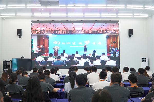 儀式伊始,通威太陽能(組件)人事行政部負責人率先對2023屆啟航生在職業生涯的出發站選擇通威表示熱烈歡迎,并鼓勵啟航生們以啟航集訓營為起點,乘著通威太陽能組件板塊快速發展的東風,不忘使命、砥礪前行。