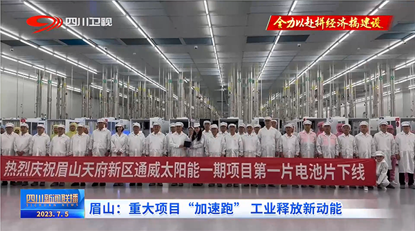 7月5日,四川衛(wèi)視《新聞聯(lián)播》、四川在線等多家主流媒體分別以《眉山:重大項目“加速跑” 工業(yè)釋放新動能》《四川天府新區(qū)(眉山片區(qū))首個“雙百億”項目正式投產(chǎn)》為題,聚焦通威太陽能彭山基地一期高效晶硅電池項目首片電池片下線。