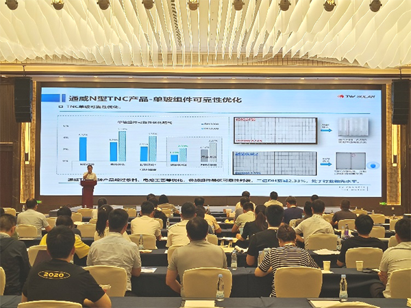 在《產(chǎn)業(yè)技術(shù)迭代下的通威n型產(chǎn)品開發(fā)》專題演講中,閆燈周介紹到通威n型產(chǎn)品秉持著量產(chǎn)一代、開發(fā)一代、預研一代的高效研發(fā)路線,通過迭代電池及組件技術(shù),持續(xù)保持產(chǎn)品功率領先性。通過高效先進的封裝工藝及無主柵、無銀化等技術(shù),通威TNC及THC組件產(chǎn)品可靠性及發(fā)電效益均處于行業(yè)領先。