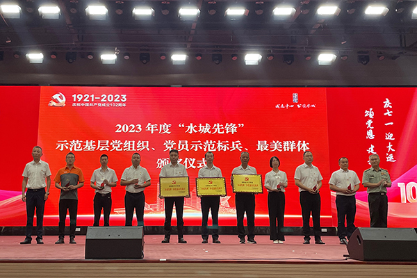 會議發布了2023年度“水城先鋒”示范基層黨組織、黨員示范標兵、最美群體名單和2022年度基層黨建“書記項目”獲獎名單,通威太陽能金堂基地黨支部榮獲2023年度“水城先鋒”示范基層黨組織稱號并作為獲獎代表領獎。