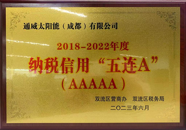 近日,國家稅務總局公布了2022年納稅信用A級納稅人名單,通威太陽能雙流基地再次被評為“A級納稅人”。至此,通威太陽能雙流基地連續八年榮膺“A級納稅人”稱號,成都市雙流區稅務局聯合雙流區營商辦為公司頒發了“五連A”獎牌。
