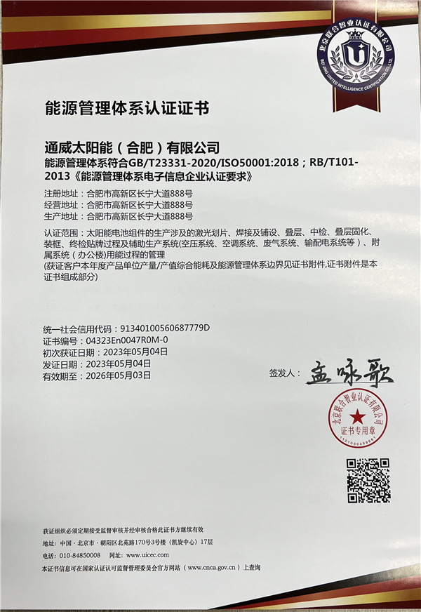 通威太陽能(合肥)有限公司 榮獲ISO50001能源管理體系認(rèn)證證書