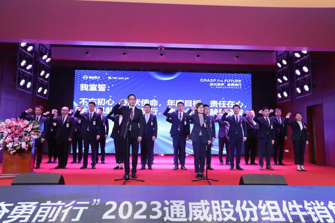會(huì)議期間,通威股份光伏商務(wù)部組件營銷全球總經(jīng)理邱新、通威太陽能(合肥)有限公司疊瓦業(yè)務(wù)部部長李巖分別作專題匯報(bào),現(xiàn)場結(jié)合行業(yè)發(fā)展趨勢(shì)及重點(diǎn)市場情況,分享半片及疊瓦組件總體銷售思路、制定營銷策略,為組件銷售團(tuán)隊(duì)賦能更多元應(yīng)用場景。同時(shí),為提振團(tuán)隊(duì)士氣,促成全年銷售目標(biāo)完成,通威股份人力資源總監(jiān)易繼成、財(cái)務(wù)部部長助理甘露現(xiàn)場宣貫組件營銷團(tuán)隊(duì)考核辦法及財(cái)務(wù)相關(guān)制度,以完善制度保障為團(tuán)隊(duì)持續(xù)成長保駕護(hù)航。隨后,組件銷售中高管團(tuán)隊(duì)帶領(lǐng)參會(huì)人員現(xiàn)場宣誓,承諾將不忘初心、全力以赴、拿下山頭。