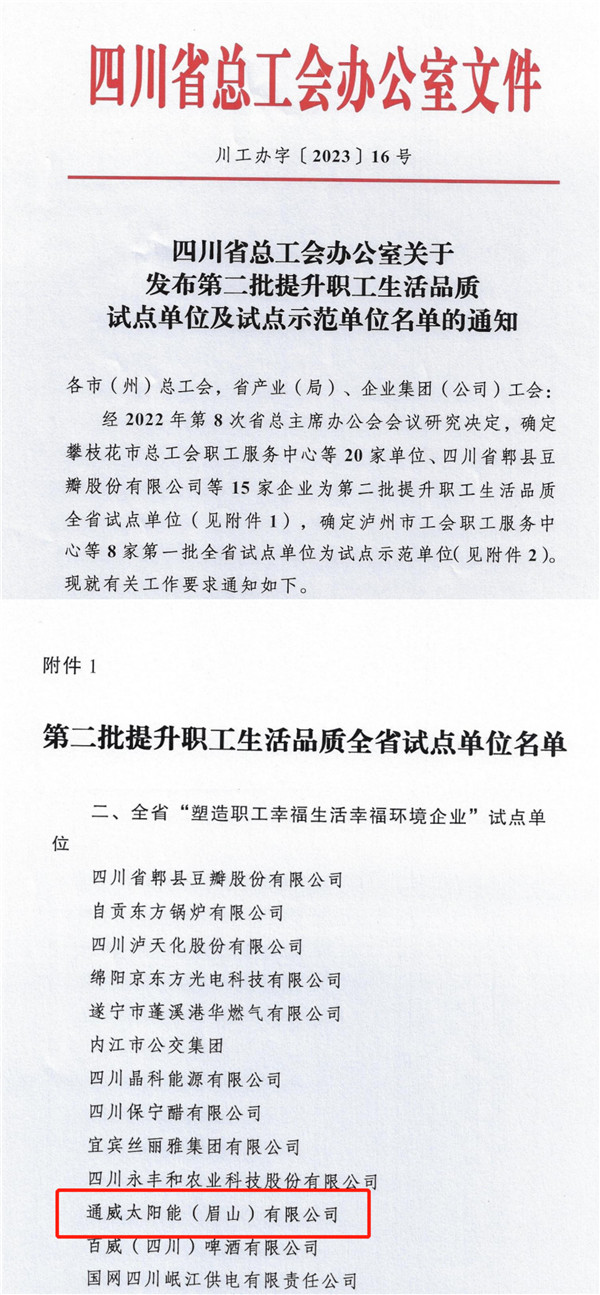 近日,四川省總工會發(fā)布了“塑造職工幸福生活幸福環(huán)境企業(yè)”試點單位名單,通威太陽能眉山基地成功入選該名單。