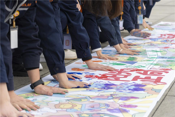 在員工簽署環節,來自各基地各廠部的200余名員工代表匯集在定制的彩色長卷四周,將代表“陽光”“正向”的彩色印泥按在手掌,印在長卷。長卷以“效率優先 陽光正向 監督保障”為主題,融合通威太陽能各基地標志建筑、陽光仔等圖案,寓意通威太陽能全體員工將以集團為引領,將通威文化、通威精神傳遞落實到生產、生活各個層面,真正做到將企業文化內化于心、外化于行、知行合一,最終助力生產經營,為集團和公司的穩健發展注入源源不斷的動力。