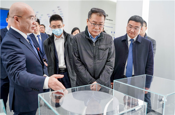 周斌總正在為查衛民委員一行介紹公司產業鏈情況