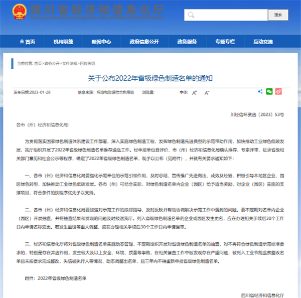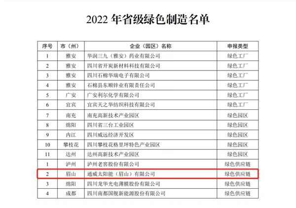 近日,四川省經濟和信息化廳網站正式公布了《2022年省級綠色制造名單》,通威太陽能眉山基地榮列其中,成為此批次眉山唯一一家獲評四川省“綠色供應鏈”管理企業(yè)。