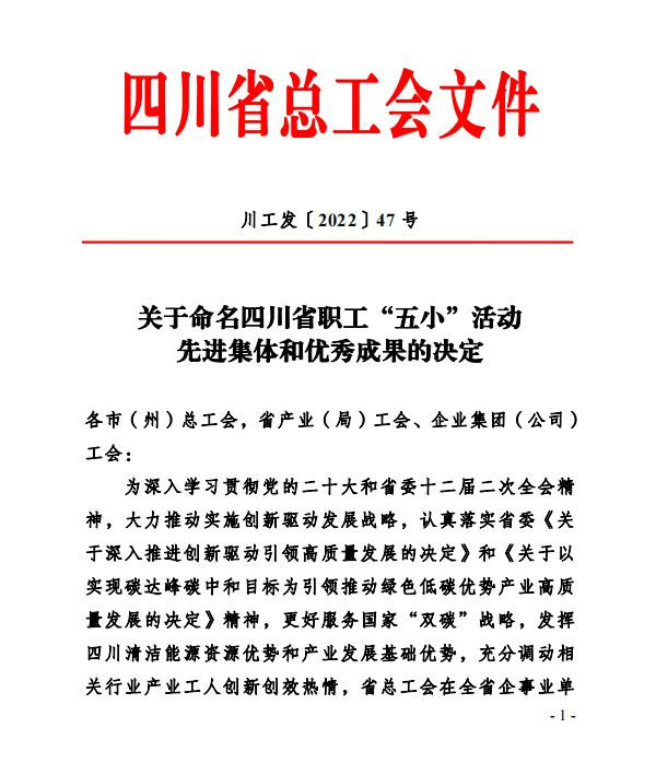 金堂基地榮獲四川省職工“五小”活動先進集體榮譽稱號