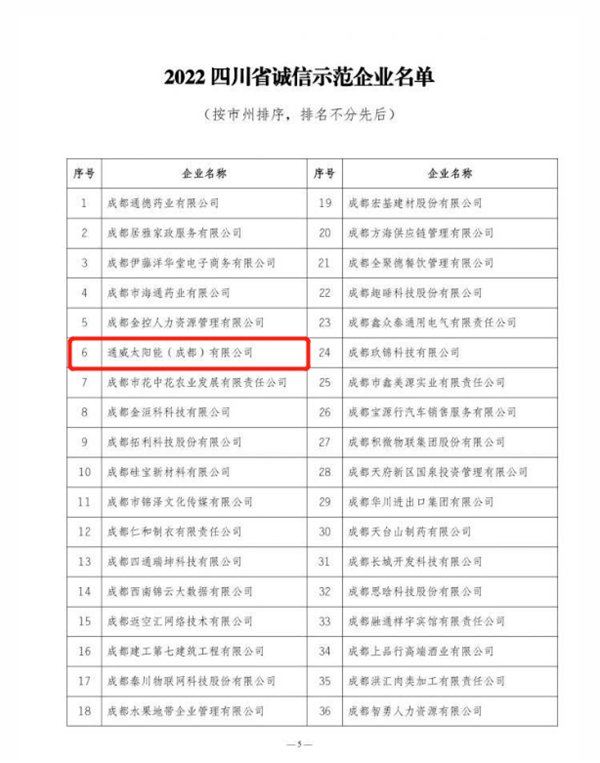 通威太陽能榮列“2022四川省誠信示范企業”名單