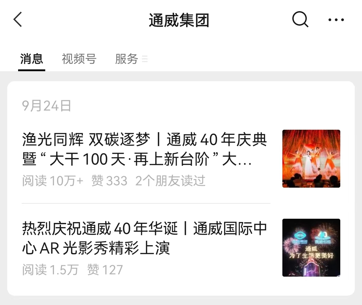 “通威集團”作為通威集團官方微信公眾號,秉持“最權威的通威聲音,最及時的產業動態,最客觀的信息解讀”原則,全年365天動態發布通威新聞資訊,貼近行業熱點,深挖產業亮點,精心策劃專題報道、特色欄目、重磅新聞,不斷在權威性、及時性、創新性方面突破更新,形成了通威獨有的體現社會責任和價值選擇的內容生態,創作出具有通威氣質的“爆款”產品。2022年全年共發布稿件近900條,原創稿件占整體數量96%,其中多篇文章閱讀量破十萬,并多次被主流權威媒體轉載發布,在行業內外形成了廣泛影響力。
