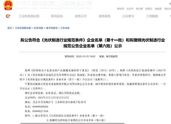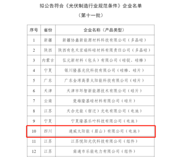 1222日,國家工業和信息化部網站對擬公告符合《光伏制造行業規范條件》企業名單(第十一批)完成公示,此次全國共遴選22家企業入圍名單,通威太陽能眉山基地作為四川省唯一入列企業,成功入選“光伏制造業規范條件”企業公示名單。