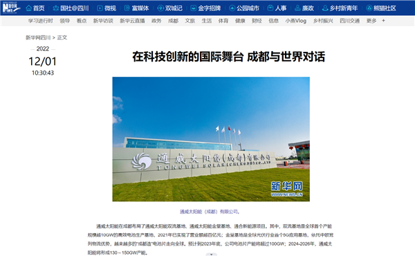 12月1日,新華網(wǎng)發(fā)布了題為《在科技創(chuàng)新的國際舞臺(tái) 成都與世界對話》的報(bào)道,其中在“綠色低碳”模塊,聚焦通威太陽能助力成都綠色低碳產(chǎn)業(yè)發(fā)展、推動(dòng)成都經(jīng)濟(jì)增長。