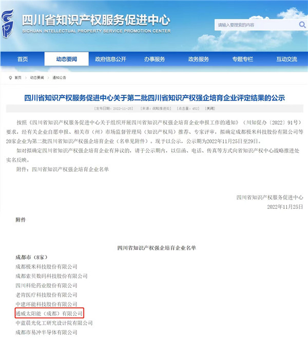 11月25日,四川省知識產(chǎn)權(quán)服務(wù)促進中心發(fā)布《關(guān)于第二批四川省知識產(chǎn)權(quán)強企培育企業(yè)評定結(jié)果的公示》,通威太陽能雙流基地憑借高質(zhì)高效的知識產(chǎn)權(quán)創(chuàng)造、運用、保護及管理等優(yōu)勢成功入圍,成為成都市本次入選的8家企業(yè)之一。