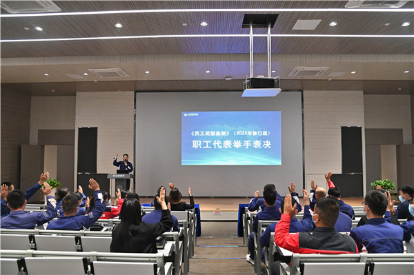 會議審議了《員工獎懲條例》2022修訂版、《員工關愛互助基金管理辦法》2022修訂版、《員工福利管理制度》等若干管理制度以及集體合同、工資合同、女職工合同三項草案,并通過主持人會上宣貫和解讀文件,職工代表舉手表決的方式,一致通過以上制度與合同草案。