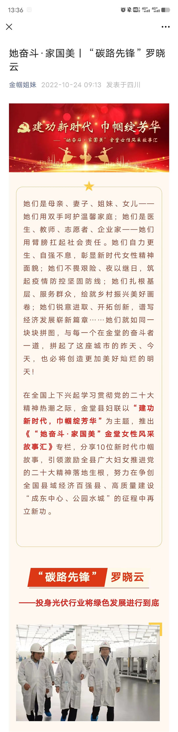 為引領激勵全縣廣大婦女,推進黨的二十大精神落地生根,10月24日,金堂婦聯以“建功新時代,巾幗綻芳華”為主題,推出《“她奮斗·家國美”金堂女性風采故事匯》專欄,分享10位新時代巾幗故事。通合新能源黨支部書記、總經理助理羅曉云作為10位代表女性之一,其投身光伏事業的奮斗故事得到婦聯的高度認可并入選此次專欄的開篇人物。