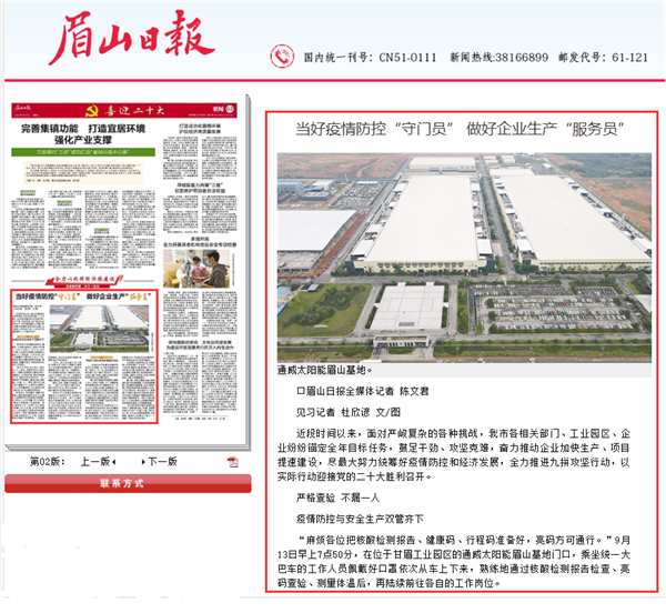 《眉山日報》聚焦通威太陽能眉山基地疫情防控與安全生產(chǎn)