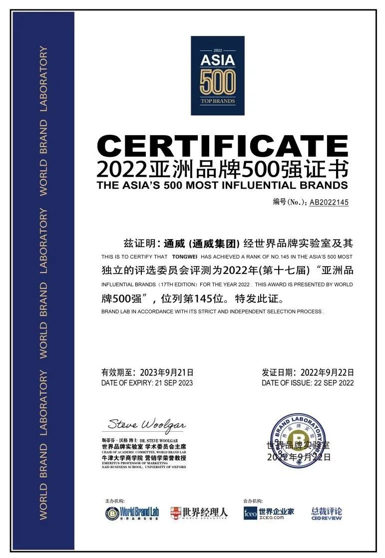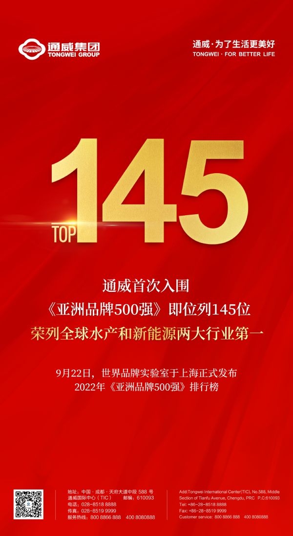在以40年為新起點,再出發(fā)、再奮進的重要時刻,通威再登國際權(quán)威榜單。9月22日,由世界品牌實驗室(World Brand Lab)主辦的“亞洲品牌大會”在上海召開,會上隆重發(fā)布了2022年《亞洲品牌500強》排行榜。通威首次入圍《亞洲品牌500強》即位列145位,榮列全球水產(chǎn)和新能源兩大行業(yè)第一,彰顯了公司穩(wěn)健的發(fā)展態(tài)勢和強勁的品牌實力。