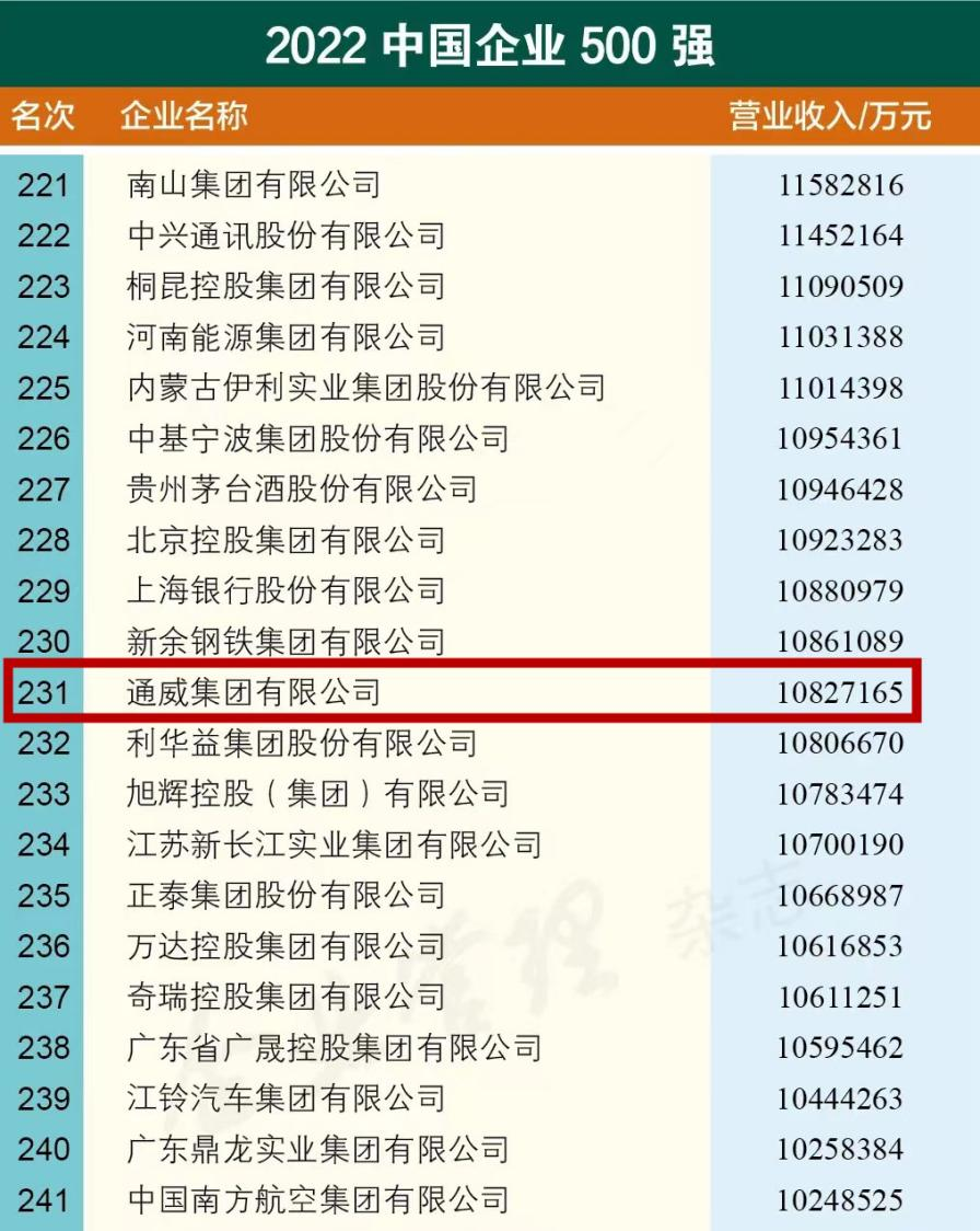 9月6日上午,中國企業(yè)聯(lián)合會、中國企業(yè)家協(xié)會發(fā)布了2022中國企業(yè)500強、中國制造業(yè)企業(yè)500強、中國服務業(yè)企業(yè)500強榜單。作為深耕綠色農業(yè)、綠色能源的大型跨國集團公司,通威以超1082億元營收,榮登“中國500強企業(yè)”第231位、“中國制造業(yè)企業(yè)500強”第107位,充分展現了在復雜多變的經濟形勢下持續(xù)穩(wěn)健的發(fā)展態(tài)勢和卓越的競爭實力。