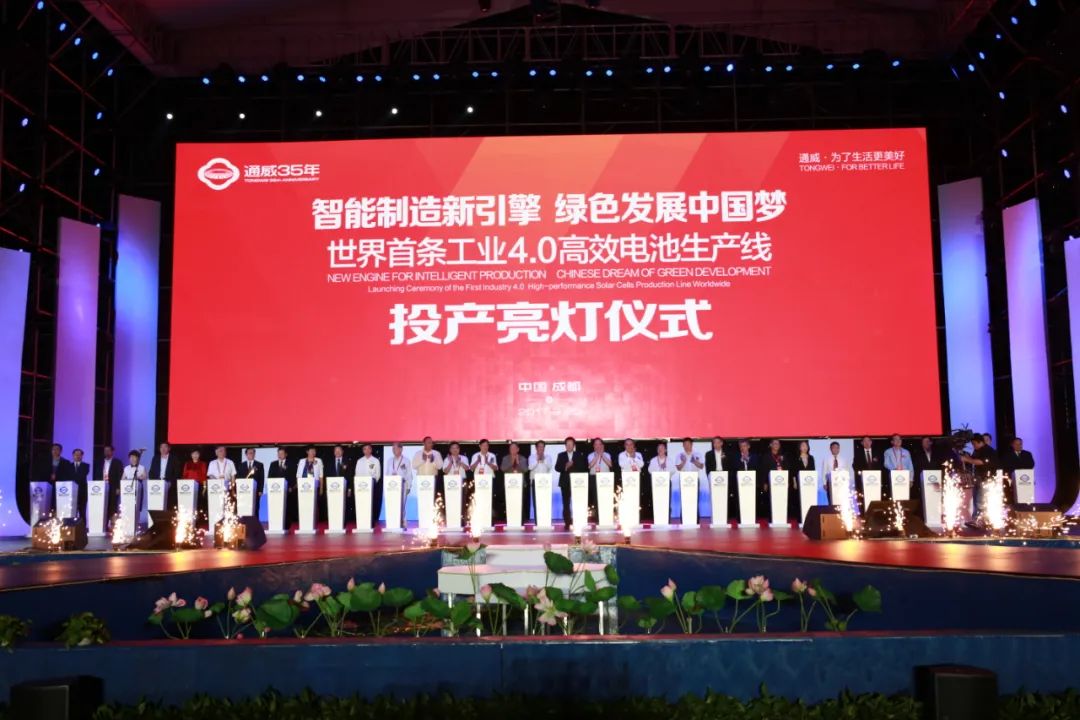 ▲2017年9月20日,劉漢元主席與嘉賓一道共同啟動通威太陽能世界首條工業(yè)4.0高效電池生產(chǎn)線投產(chǎn)亮燈儀式