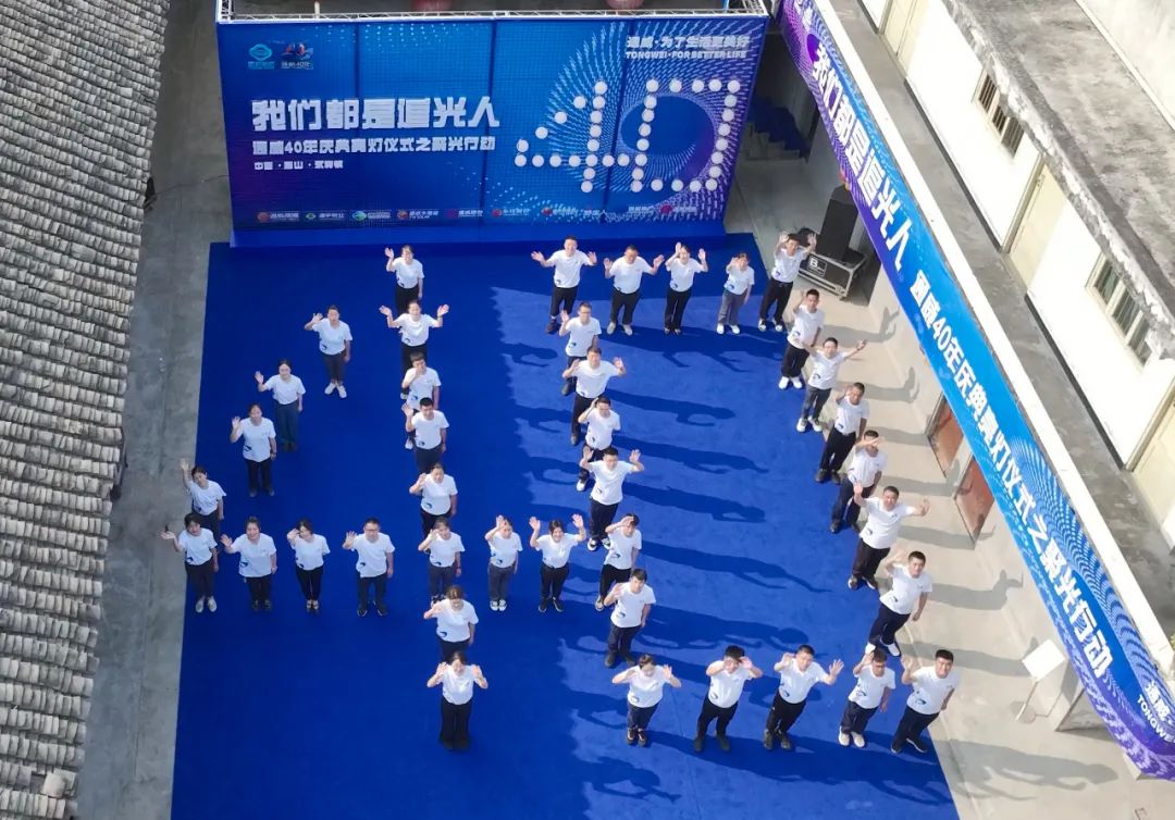 隨后,40位追光代表拎著聚光燈,有序地跑向通威前身眉山縣漁用配合飼料廠。這是劉漢元主席自行設(shè)計、自行施工、自行安裝建起的第一家工廠,也是西南地區(qū)第一家集約化魚飼料廠,見證了通威的第一次轉(zhuǎn)型開拓。在眉山縣漁用配合飼料廠原址,40位追光代表依次將聚光燈掛在背景裝置上,用光點匯聚起“通威之光”。