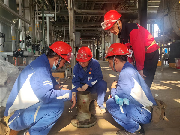 在檢修施工現(xiàn)場(chǎng),劉總一行全面查看了施工進(jìn)度,詳細(xì)了解設(shè)備運(yùn)行的流程和參數(shù),并提出施工要求。劉總對(duì)發(fā)現(xiàn)的問題與各領(lǐng)導(dǎo)各專業(yè)一起在現(xiàn)場(chǎng)進(jìn)行討論,制定解決方案,要求舉一反三嚴(yán)防類似問題再次發(fā)生。